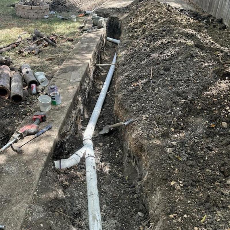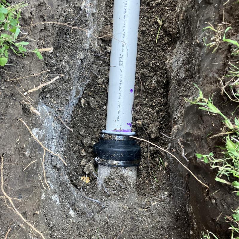 Westside Plumbing replaced an old concrete sewer line in Fort Worth, Texas. Technicians installed 100 feet of new four-inch PVC pipe, connected it to the city tap, and tied in household drain lines. They removed a shed, cleaned the site, and completed city-permitted inspections, backfilling and grading the area after work.